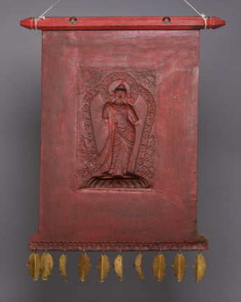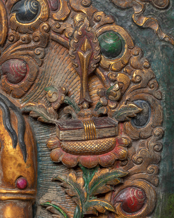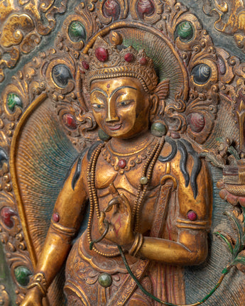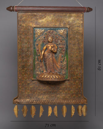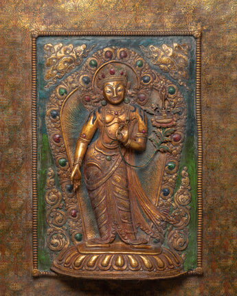 A metal thangka is a type of thangka painting that is made on a metal surface rather than on traditional canvas or paper. Metal thangkas are often made using copper, brass, or silver and are usually decorated with intricate designs and Buddhist iconography using a technique called repoussé. This involves hammering the metal from the reverse side to create a raised relief image on the front. Metal thangkas are known for their durability and are often used in ritual contexts or as decorative pieces in Buddhist homes and temples. They are particularly common in Tibet, where they have been produced for centuries.