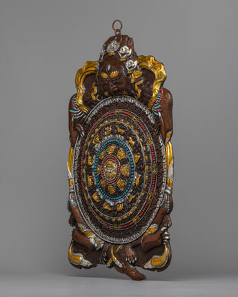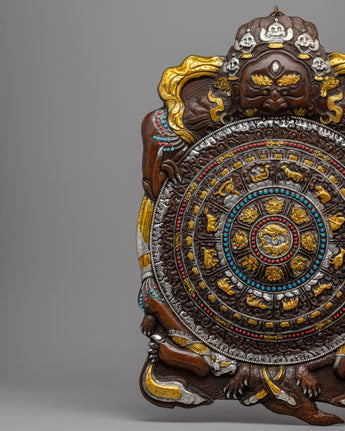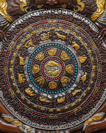 The calendar's iconography is full of meaning and symbolism. The inner circle contains the Eight Auspicious Symbols (Ashtamangala), which signify good fortune, prosperity, and spiritual well-being in Buddhist culture. Surrounding this major topic, the second circle displays 12 distinct animals, each representing one of the years in the Tibetan lunar calendar and expressing the attributes and energy connected with that animal. Together, these pieces form a striking visual picture of time, spiritual abundance, and Buddhist teachings. Displaying this calendar not only improves your living area, but also serves as a daily reminder of life's interdependence and the blessings that each year provides.