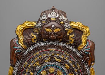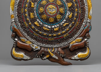 The Metal Wall Hanging Buddhist Calendar is a stunning work of art, precisely built from oxidized copper and delicately plated in electro gold and silver. This gorgeous calendar is 42 cm tall and 27.5 cm wide, weighing a total of 0.87 kg, making it a lightweight yet impactful addition to your decor. The brilliant artificial stones of coral and turquoise bring color and spirituality to this item, taking it to an impressive degree of craftsmanship.