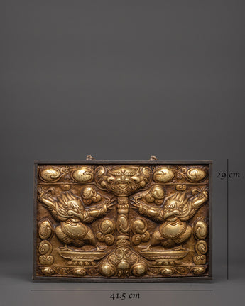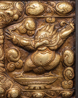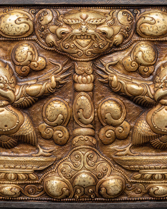 This Mythical Garuda Wall Hanging is an exquisite depiction of the Garuda, a legendary bird and protector god in Buddhist and Hindu religions. This wall plaque is handcrafted from brass with an iron frame and weighs 2.18 kg. It is 29 cm in height and 41.5 cm in width. The Garuda is shown in a forceful position, representing strength, protection, and courage. The elaborate engravings feature excellent detailing of legendary patterns, cloud motifs, and protective symbols, resulting in a visually appealing work that captures the essence of Himalayan artistry. This brass wall hanging is ideal for meditation rooms, living spaces, or sacred places, as it radiates a powerful and regal aura that provides spiritual protection.