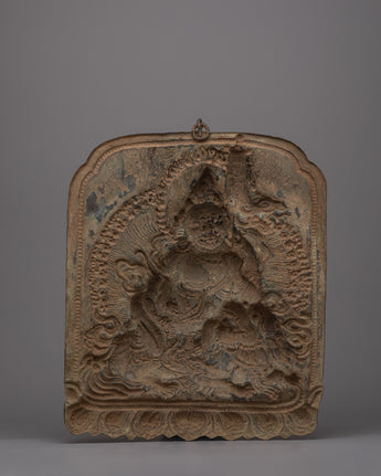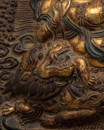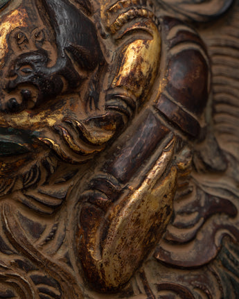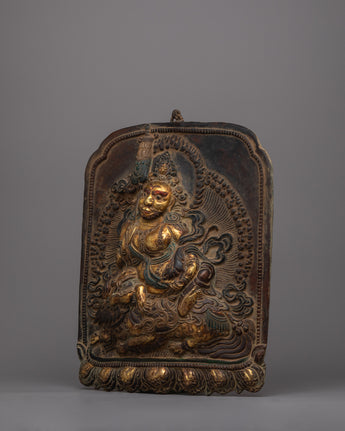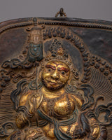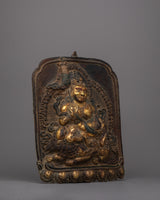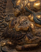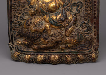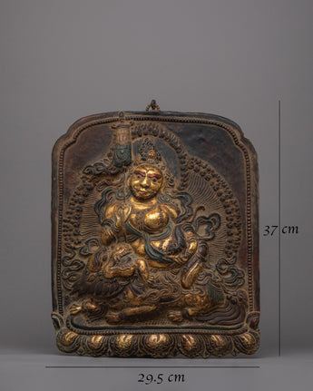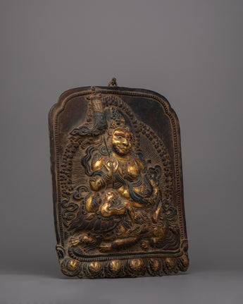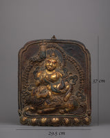 We are presenting the exquisitely made Namotoshe Wall Hanging, which captures the holy spirit of Namotoshe, the revered God of Wealth in Tibetan Buddhism. This wall hanging, 37 cm tall and beautifully carved on a copper body with opulent gold plating, is a striking addition to any house or hallowed area: the exquisite detailing and brilliant polish showcase Namotoshe's remarkable craftsmanship and profound spiritual meaning.
