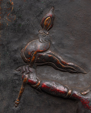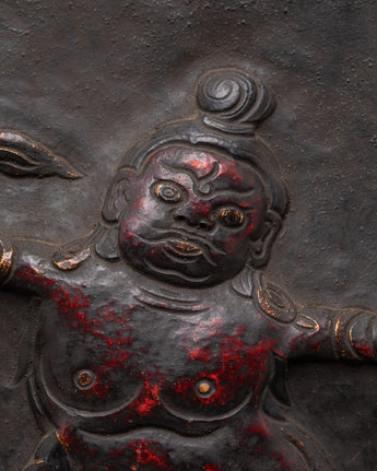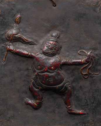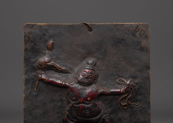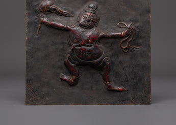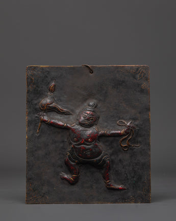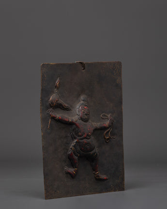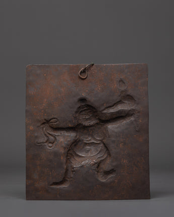 Every element of the guardian god is carefully crafted, from the expressive face to the dynamic attitude, to portray the protective energy venerated in esoteric Buddhist traditions. This figure is frequently linked with repelling negativity and protecting sacred locations. The plaque's tough patina and texture give it an archaic, ritualistic quality, tying it to traditional Himalayan craftsmanship and sacred practice. The hook at the top allows for simple hanging in homes, studios, or temples.