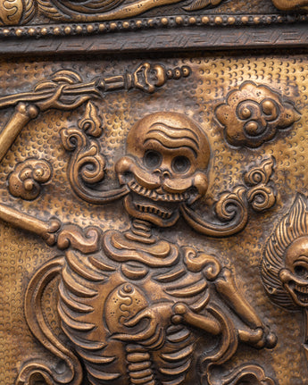 Discover the captivating beauty and profound spiritual significance of the Tibetan Chittipati Wall Art. Meticulously handcrafted from brass, this striking piece measures 45 cm by 33 cm and serves as a powerful emblem of protection and enlightenment. Traditionally utilized in Tibetan rituals, the Chittipati, known as the "Lord of the Dead," symbolizes spiritual guidance, protection against negative influences, and a deep connection to the afterlife. Its intricate brass design adds both aesthetic appeal and spiritual strength, making it an ideal addition to homes, temples, or meditation spaces.