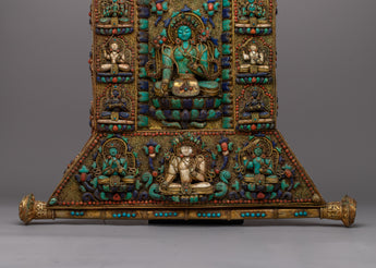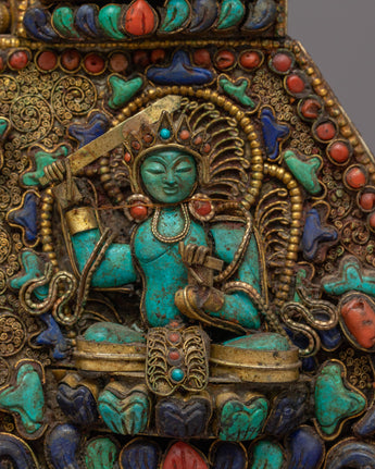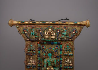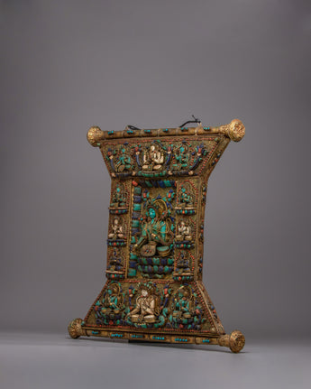This wall decor is a valuable relic that represents fine craftsmanship and deep spiritual values, not just a pretty decoration. This piece is made with genuine stones and intricate copper work that is a reflection of traditional Tibetan methods, making each one exceptional and one-of-a-kind. A treasured addition to any collection or sacred space, the Wall Tapestry of Tibetan Buddhist Deities is a monument to the rich spiritual tradition and creative legacy of Tibetan Buddhism.