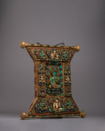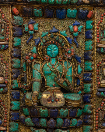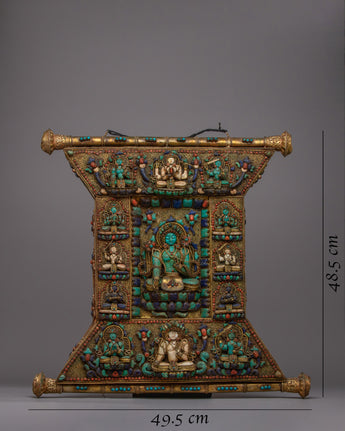 The Wall Hanging of Tibetan Buddhist Deities, an exquisite artwork that unites profound spirituality with excellent workmanship. This thanka, which is handcrafted from a copper body and has electro gold plating on it, has original stones such as conch shell, turquoise, coral, and lapis lazuli. This thanka is heavy and eye-catching, measuring 48.5 cm in height by 49.5 cm in width and weighs 5.67 kg.