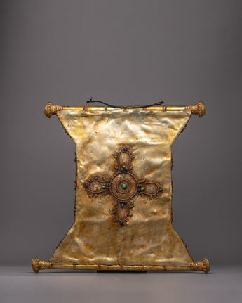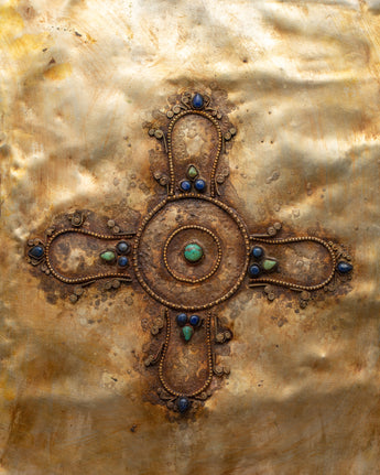 A metal thangka is a type of thangka painting that is made on a metal surface rather than on traditional canvas or paper. Metal thangkas are often made using copper, brass, or silver and are usually decorated with intricate designs and Buddhist iconography using a technique called repoussé. This involves hammering the metal from the reverse side to create a raised relief image on the front. Metal thangkas are known for their durability and are often used in ritual contexts or as decorative pieces in Buddhist homes and temples. They are particularly common in Tibet, where they have been produced for centuries.