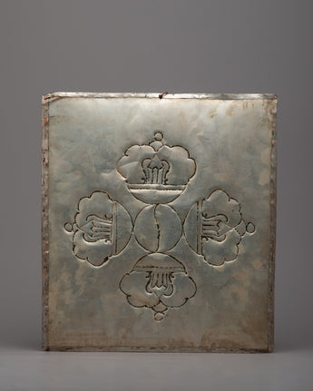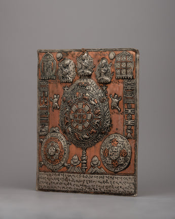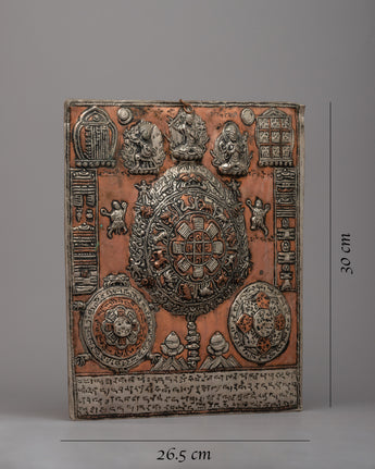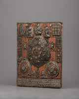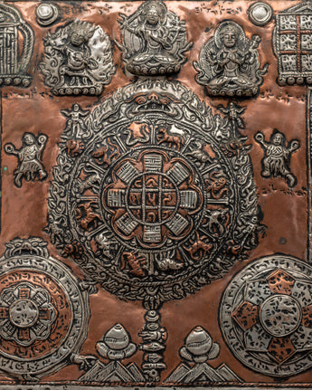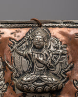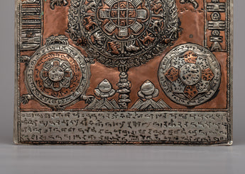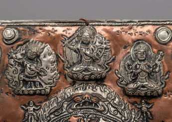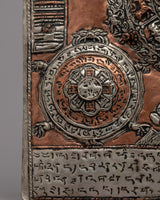 The Wheel of Life with Others Metal Thanka is a mesmerizing piece of artistry meticulously handcrafted on a copper body and adorned with silver plating. This intricate depiction showcases a captivating interplay of various deities and symbols, intricately woven together to tell a profound spiritual narrative. At the heart of this artwork lies the Wheel of Life, symbolizing the cycle of existence and the fundamental principles of Buddhist teachings. Around this central motif, different deities and symbols are artfully rendered, each contributing to the rich tapestry of meaning and symbolism. The attention to detail is exemplified not only through the skillful representation of the deities but also in the placement of mantras at the bottom of the Thanka, infusing the artwork with spiritual energy. This masterpiece serves as a powerful visual tool for meditation and contemplation, inviting viewers to explore the depths of Buddhist philosophy and the interconnectedness of all beings.