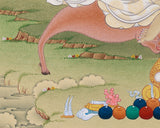 Discover the profound spiritual realm of Tibetan meditation through this Buddhist Master Milarepa Thangka. Created within our Enlightenment Studio, this handmade painting is executed on premium cotton canvas utilizing natural Lhasa stone pigments and 24K gold. The Thangka radiates both spiritual significance and aesthetic beauty. The stone pigments yield vibrant hues with enduring richness, while the gold accents highlight the sacred figures' divine nature. Adhering to the traditional Karma Gadri style, renowned for its serene design, intricate craftsmanship, and harmonious composition, this thangka functions as both an exquisite artwork and a revered object of devotion.