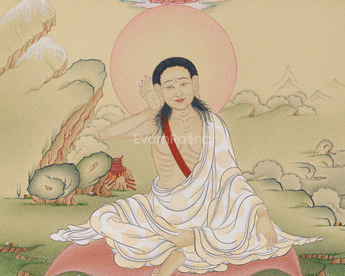 This thangka depicts Milarepa in a meditative pose, with one palm cupped to his ear, symbolizing his mastery of poetry and music. At the top center is Vajradhara, the primordial Buddha, representing the source of enlightened blessings and highlighting the transmission of wisdom and spiritual lineage. The painting illustrates the sacred bond between teacher and disciple and the balance between earthly practice and divine guidance. Every detail, from Milarepa's simple robes to Vajradhara's radiant aura, is meticulously hand-painted, creating a visual narrative that encourages devotion and reflection. Placing this Milarepa with Vajradhara thangka in your sacred space will allow its divine energy to inspire your meditation, uplift your spirit, and connect you with the timeless wisdom of Tibetan masters.