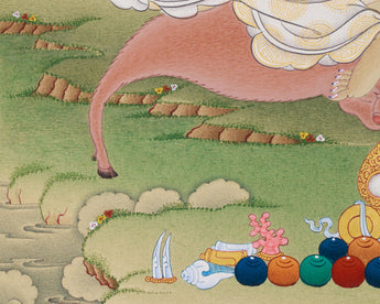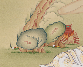 Explore the deep spiritual world of Tibetan meditation with this stunning Milarepa with Vajradhara Thangka. Created in our Enlightenment Studio, this beautifully hand-painted piece is made on premium cotton canvas using natural Lhasa stone pigments and 24K gold. The thangka shines with both spiritual significance and visual beauty. The stone pigments provide vibrant colors and lasting richness, while the gold accents make the sacred figures stand out, emphasizing their divine essence. Following the traditional Karma Gadri style, which is known for its peaceful design, intricate workmanship, and harmonious balance, this thangka serves as both a beautiful work of art and a treasured object of devotion.
