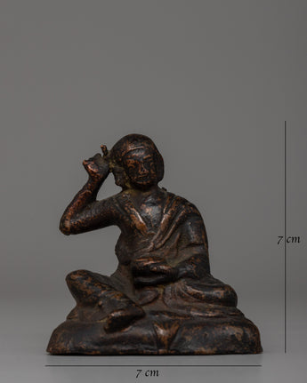 This vintage bronze statue, a gorgeous handcrafted representation of the famed Buddhist saint Jetsun Milerepa, commemorates the teachings of the great Buddhist Yogi. This finely carved figurine, measuring 7 cm in height by 7 cm in breadth and weighing 0.204 kg, depicts the yogi in his distinctive meditation posture, symbolizing enlightenment, strength, and devotion to spiritual practice.