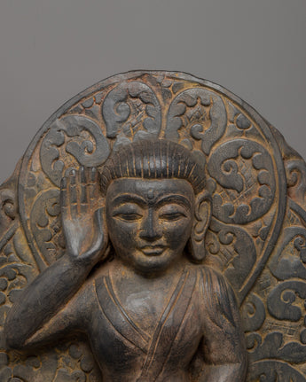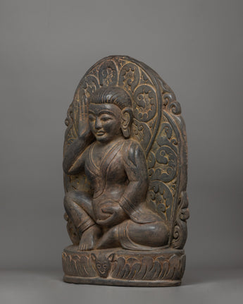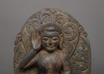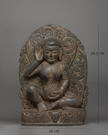 This hand-carved sculpture is a physical representation of Milarepa and a symbol of his teachings and spiritual wisdom. The floral carvings in the halo and the overall design highlight the artisan's dedication to honoring Milarepa’s profound legacy. It would make an excellent addition to any spiritual space, altar, or collection, bringing beauty and a sense of peace to the environment.