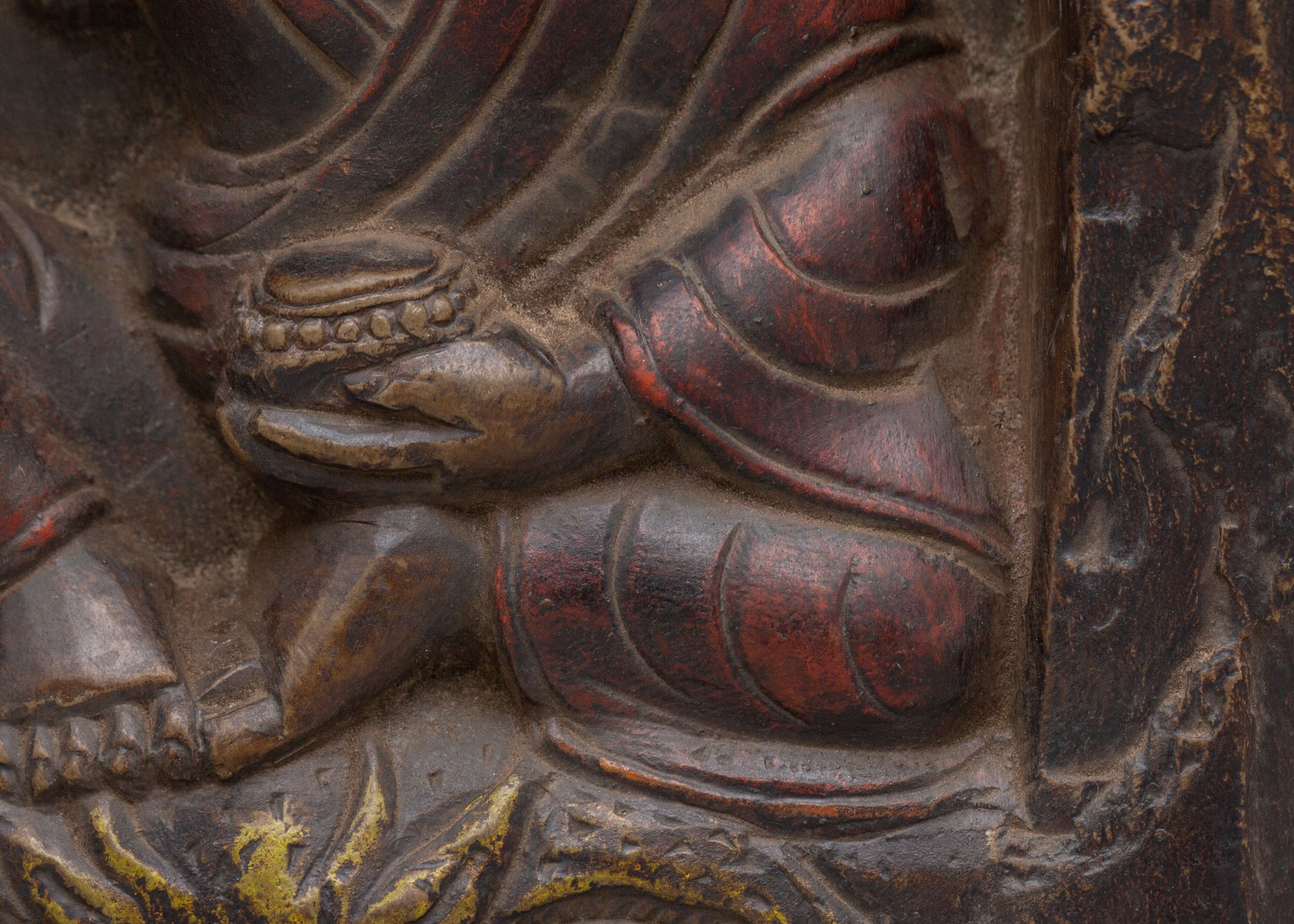 Jetsun Milarepa was a prominent Tibetan yogi, poet, and teacher who flourished in the 11th and 12th centuries. The master's clothing with basic ornamental embellishment alludes to his cave life. The throne is covered with deer hide and carved with Ashtamangala (eight auspicious symbols).