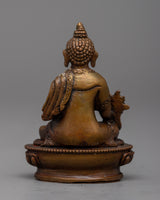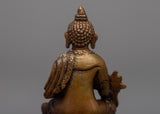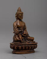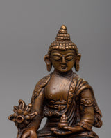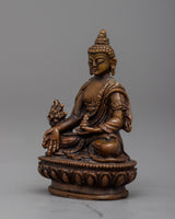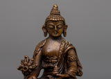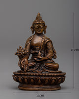 Presenting the exquisitely created Blue Buddha Medicine Statue, fashioned from corroded copper. This little sculpture, which weighs 0.072 kg and is 6 cm in height by 4 cm in width, shows the healing Buddha in a calm posture. The sculpture's delicate features are emphasized by the ageless appearance of the Oxidzied copper.
