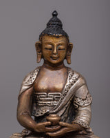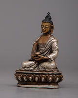 The 8-cm-tall Copper Amitabha Buddha Statue is skillfully created on an oxidized copper body using a machine-made process and embellished with silver plating. This magnificent statue represents the enlightened attributes of wisdom, compassion, and boundless light.