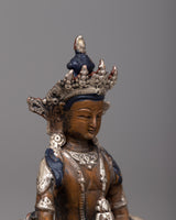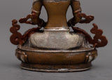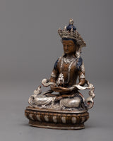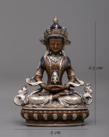 The 6.5-cm-tall Machine-Crafted Amitayus Buddha Statue has a body made of oxidized copper and is beautifully plated in silver. Often referred to as the Buddha of Infinite Life, Amitayus is seen in a calm pose, exuding longevity and compassion. The statue represents the desire for a long, fulfilling life that is full of enlightenment and spiritual development.