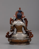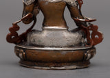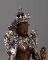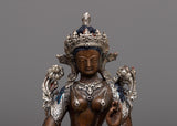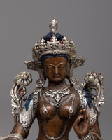The machine made is 6.5-cm-tall Green Tara Goddess Statue is beautifully silver-plated and has an oxidized copper body. This small but finely crafted statue depicts Green Tara, a sacred character in Tibetan Buddhism who is renowned for her kindness, discernment.