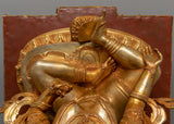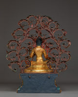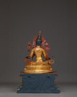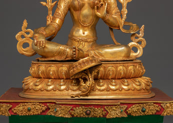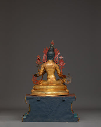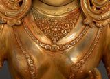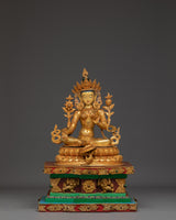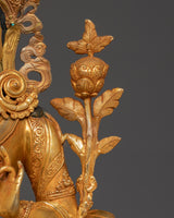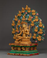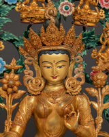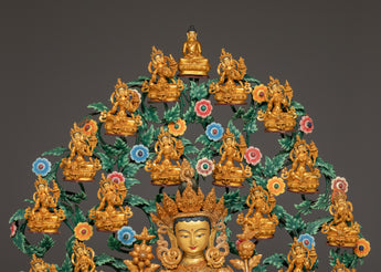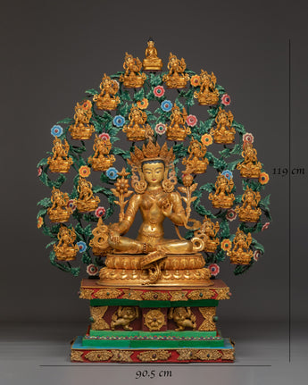 This sacred 21 Tara Set, meticulously created by Nepalese artists, has a center Green Tara statue embellished with 24K gold plating, surrounded by twenty smaller Tara sculptures electro-gold plated and detailed with bright acrylic colors and handcarved jewels. The set's large size—119cm tall by 90.5cm wide—and copper craftsmanship give it a strong presence in any spiritual altar or meditation place. Green Tara, the leader of the twenty-one, extends her right hand in the Varada Mudra for blessings and protection, while her left hand forms the Three Jewels Mudra, symbolizing devotion to the Buddha, Dharma, and Sangha. Her central placement highlights her as the source of all compassionate activity