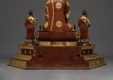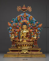 The Tibetan Shakyamuni Buddha Statue is not only an astonishing ornamental sculpture, but also a spiritual artifact designed to improve meditation and mindfulness. The oxidized copper has been meticulously worked to give the Buddha a celestial radiance, which is enhanced by the hand-applied acrylic color. The backdrop's exquisite designs, which feature detailed celestial motifs and vibrant floral patterns, underscore the cosmic significance of the Buddha's teachings. The golden crown, floral adornments, and sacred symbols surrounding the Buddha's figure enhance its spiritual and cultural significance. This statue fosters a deeper connection to Buddhist traditions and serves as an excellent focal point for any meditation practice. With its intricate craftsmanship and spiritual importance, this statue is more than just a beautiful piece; it is an invitation to contemplate the Buddha's wisdom and the path to enlightenment. It is intended to encourage peace, mindfulness, and spiritual growth, whether placed in a sacred area or your own house. The Shakyamuni Buddha Statue promotes compassion and inner tranquility, making it a prized possession for anybody on a spiritual path.