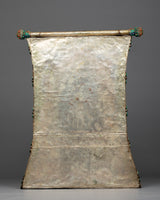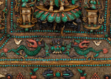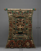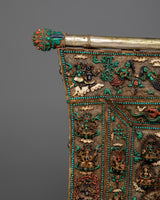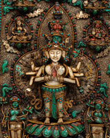 Discover the ethereal beauty of our Boho Wall Hanging, a magnificent piece that perfectly captures the spirit of spiritual depth and handcrafted skill. This impressive artwork, which weighs 15.95 kg and is 91 cm tall and 73 cm wide, is handcrafted on a copper body. Its exquisite craftsmanship and eye-catching visual appeal are enhanced by its opulent 24k electro gold and silver plating finish. Beautifully depicted in the traditional Thanka art style, the 1000-armed Chenrezig is the focal point of the work, surrounded by a variety of other deities and significant elements.