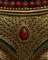 Introducing our premium Buddha Mask Wall Hanging, a stunning mix of artistry and spirituality precisely crafted in copper and finished with a luxurious gold plating. Standing elegantly at 23cm, this magnificent masterpiece is enhanced by creative inlays of coral, turquoise, and lapis lazuli stones, each filling the mask with its own energy and symbolism.