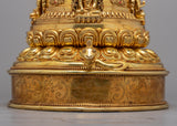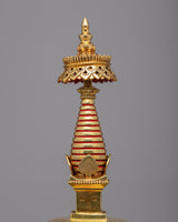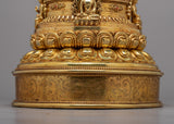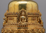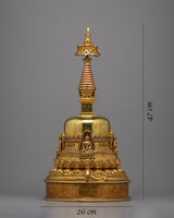 Introducing the Divine Buddha Stupa, a magnificent work of art that was painstakingly handcrafted on a body of gleaming copper. This stupa, which is lavishly plated in 24k gold, displays a sense of holiness and divine beauty.. Its unique semicircle shape captivates the eye, while the intricately crafted deities bring a sense of spiritual reverence. Every element, from the carefully designed to the precisely positioned gold accents, displays the commitment and creativity put into its creation. Take advantage of the beautiful Buddha Stupa's profound symbolism and blessings, and allow its presence to advance your spiritual development.