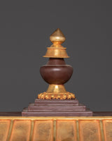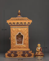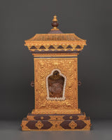 The Ghau Box is made of copper and beautifully gold-gilded, with a finely detailed silver frame that reflects the purity and enlightenment found in Tibetan Buddhist art. The design includes exquisite lotus petals, which signify spiritual purity, as well as flame symbols, which symbolize wisdom's transformational potential. The arched throne around the Buddha statue resonates with the exquisite design of Himalayan monasteries, resulting in a peaceful retreat. The beautiful engravings and Tibetan motifs attract blessings while elevating the spiritual ambiance in your home.