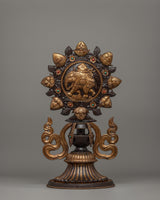 The King and Queen are central to the design, representing royal wisdom and compassion, ruling with righteousness, and guiding devotees to enlightenment. Surrounding them with offering set and the Dharma Wheel, which represents Buddha's teachings as well as the eternal cycle of life and reincarnation. Below this sacred emblem is a protector deity, a powerful guardian who protects practitioners from negativity and impediments. The horse and elephant sculptures at the base indicate strength, perseverance, and auspicious energy. These all are important attributes in Buddhist practice.