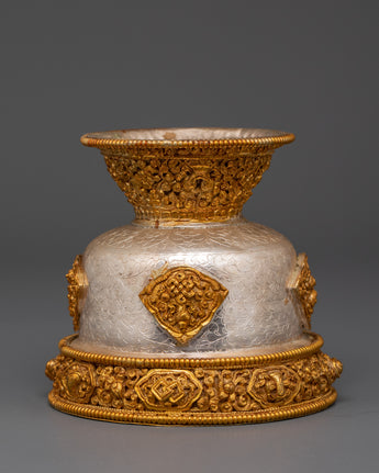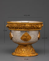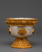 Enhance your spiritual practice with this stunning Buddhist Silver Offering Bowl Set, a painstakingly wrought ensemble ideal for altar rites and devotional offerings. Each bowl exudes beauty and sanctity, having been crafted from fine silver and gold-plated copper. These sacred jars, which measure 9.5 cm in height, 10.5 cm in diameter, and have a deep 7 cm inner cavity, are suitable for holding water, rice, or symbolic offerings during daily pujas and ceremonial events. These bowls, whether placed on a shrine, meditation altar, or temple, offer both aesthetic beauty and religious functionality.