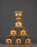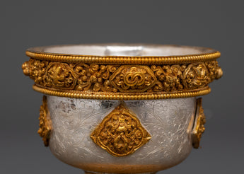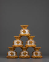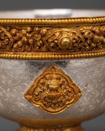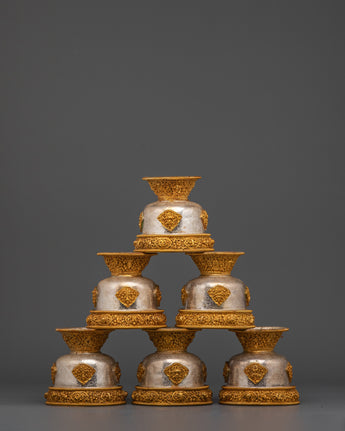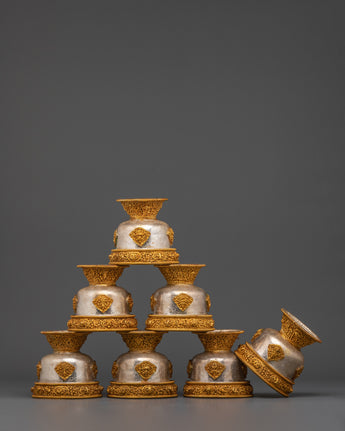 This set comprises seven matching bowls, each weighing approximately 0.35 kg, for a total weight of 2.49 kilograms, showcasing superb craftsmanship. Gold-plated copper decorations adorn the bases and rims of the bowls, emphasizing traditional Tibetan symbols that represent prosperity and reverence. The use of silver and gold not only adds to the set's visual appeal, but it also represents purity and spiritual vitality, making it a perpetual. Ritual item for Buddhist, Tibetan, and Himalayan practitioners.