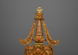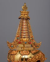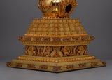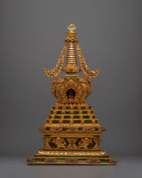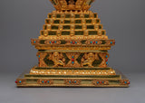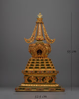 Introducing the exquisitely carved Chorten Tibetan Stupa, a handcrafted emblem of enlightenment and spiritual reverence. This magnificent stupa, which stands an amazing 55 cm tall, was carefully crafted from a Copper body and lavishly plated in gold. Intricate Turquoise and Coral stone inlay adds vivid beauty and profound symbolic meaning, signifying spiritual balance, healing, and protection. This stupa is a timeless object that reflects the profound teachings of Tibetan Buddhism; it is not just a decorative element.