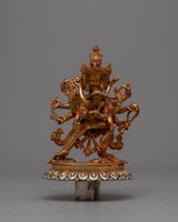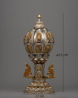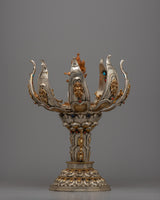 The beautifully carved Copper Lotus Mandala, adorned with dazzling 24k gold and silver plating, is a testament to artistic mastery and spiritual dedication. Standing at a height of 40.5 cm, it symbolizes great spiritual significance that evokes awe and reflection. Its distinctive characteristic makes it unique: when the lotus is gently opened, the divine Heruka at its core is revealed, encircled by other deities that are finely etched onto the flower's petals. Coral and Turquoise stone inlaid