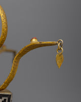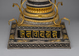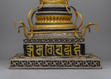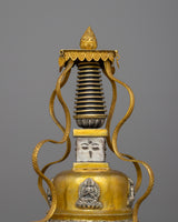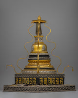 This majestic Buddhist stupa is rooted in both earthly solidity and divine purpose by its strong square base, which is decorated with sacred "Ranjana" script writing and beautiful black-and-white geometric patterns. While the stupa's main body, or bumpa, symbolizes a lot and has a fine sculpture of the Buddha radiating blessings, the lotus foundation surrounding it symbolizes purity and spiritual elevation. The harmika rises above, its serpentine tendrils representing protection from all sides and its spire, topped with an umbrella and a finial shaped like a flame, representing the path to enlightenment. The stupa is a symbol of calm, knowledge, and spiritual development because of its elaborate intricacies and embedded diamonds, which increase its auspiciousness.