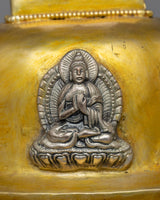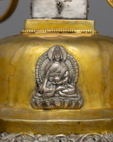 This beautiful Decorative Buddhist Stupa Sculpture, which stands 63 cm tall and 42 cm wide and weighs about 6.21 kg, is made from a strong copper body covered in layers of fine metal sheet. It is coated in silver and has gold gilding. This holy art has a distinctive touch because every detail is hand-painted. The stupa is frequently used as a meditation aid and a reminder of the spiritual path in Buddhist tradition. It is a profound emblem of the Buddha's enlightened mind.