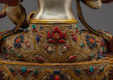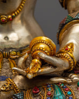Vajrasattva is seen seated in tranquil meditation, holding the vajra in his right hand, representing indestructible wisdom, and the ghanta in his left, representing the harmony of wisdom and compassion. His serene visage exudes purity and spiritual strength, reflecting his position as the ultimate purifier of negative karma. The delicate yet bold filigree designs that surround the statue offer a layer of elaborate craftsmanship that recalls centuries of Tibetan expertise. Each turquoise and coral stone is meticulously positioned to add spiritual meaning and aesthetic appeal, resulting in a harmonic combination of color, texture, and symbolism.