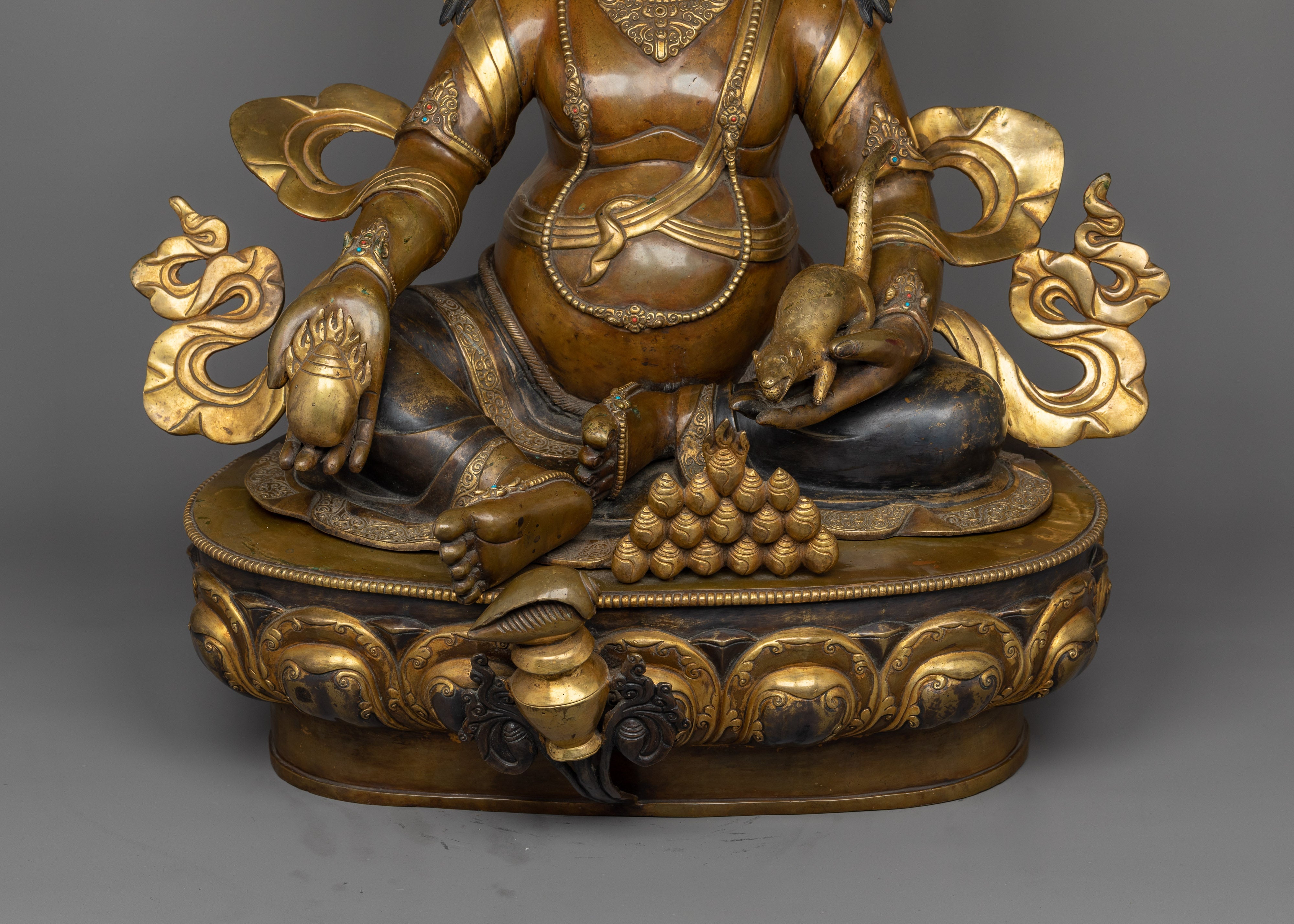 The artistry on this statue is very excellent. The wonderful carvings on Dzambala's flowing robes, the lifelike features of his face, and the complex patterns on his lotus seat are all enhanced by the sumptuous gold gilding and oxidized finish. These features bring depth and vibrancy to the statue, increasing its visual appeal and spiritual importance.
