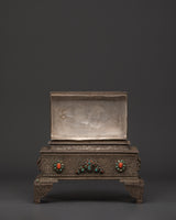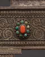 This gemstone-decorated treasure box is not only a useful storage solution, but it also expresses ethnic creativity and spiritual attractiveness. This silver box with jade, coral, and turquoise is an excellent addition to any collection, whether used as a centerpiece in your house or as a sacred receptacle for spiritual goods. This keepsake box is ideal for vintage collectors, jewelry aficionados, and those who value handcrafted ethnic treasures. It flawlessly integrates beauty, heritage, and usefulness.