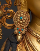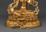 Experience the amazing elegance of our Green Tara, a Nepalese handmade statue delicately constructed in Patan, Nepal. This beautiful statue is a perfect example of the rich legacy of Nepalese craftsmanship. It is made from finest copper and gilded with 24K gold. As the "Mother of Liberation," Green Tara is portrayed in a composed yet animated pose, signifying her preparedness to provide protection and direction. Everything about her, from her calm demeanor to the elaborate designs on her robes, exemplifies our artists' extraordinary skill. The statue's heavenly beauty and spiritual importance are further enhanced by the vivid acrylic and gold paintwork and the hand-carved gemstones.
