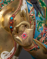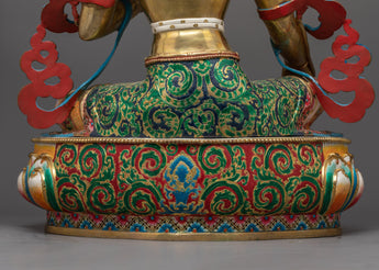 The sculpture, made of high-quality copper and gilded in 24K gold, depicts Green Tara in her usual attitude of serene preparation. The vivid gold and acrylic paints highlight her sympathetic expression and gracefully flowing robes, bringing to life her promise of protection and charity. Weighing 17.35 kg, it has an anchoring and uplifting presence, making it great for anybody looking to strengthen their spiritual practice or add a bit of divine feminine to their home.