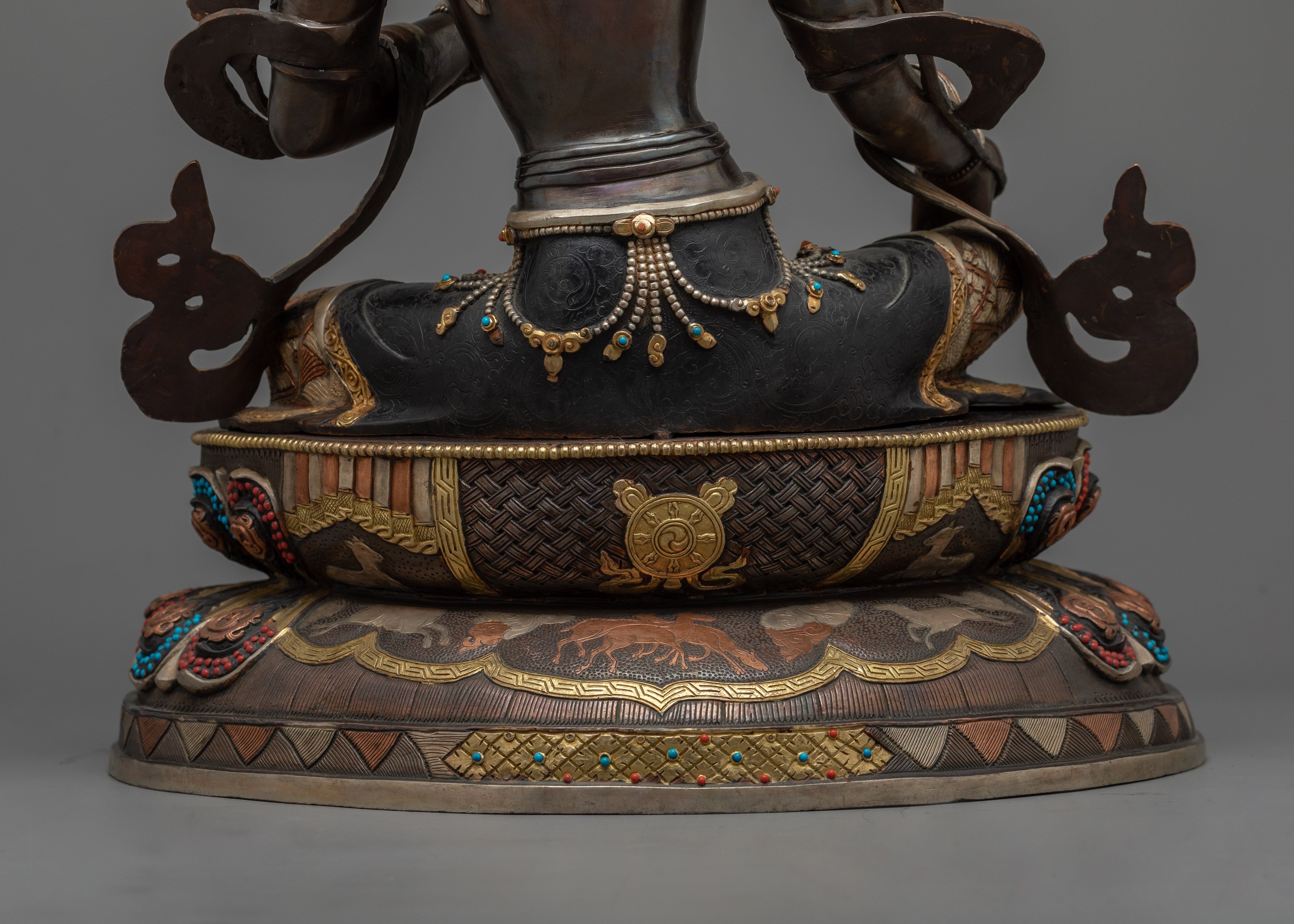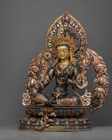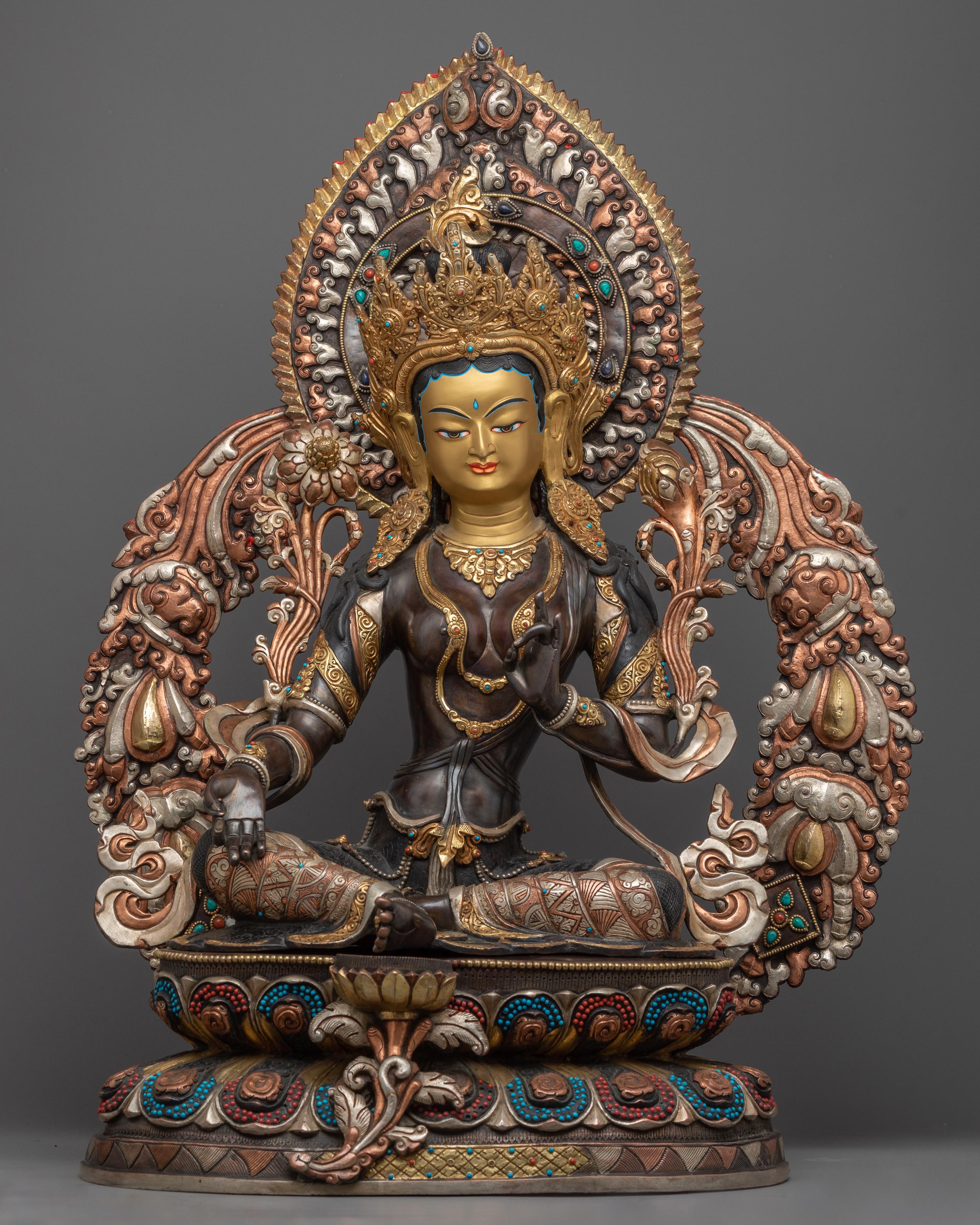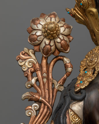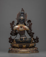 This holy energy is reflected in every aspect of our Green Tara statue. The oxidized copper body adds an ancient touch, while the gold gilding and silver plating highlight the delicate carvings, oozing divine radiance. The acrylic paintings provide a lively touch to the statue, bringing it to life. This sculpture serves as a powerful reminder of Green Tara's caring energy, making it an outstanding gift for individuals seeking spiritual protection and release.