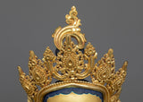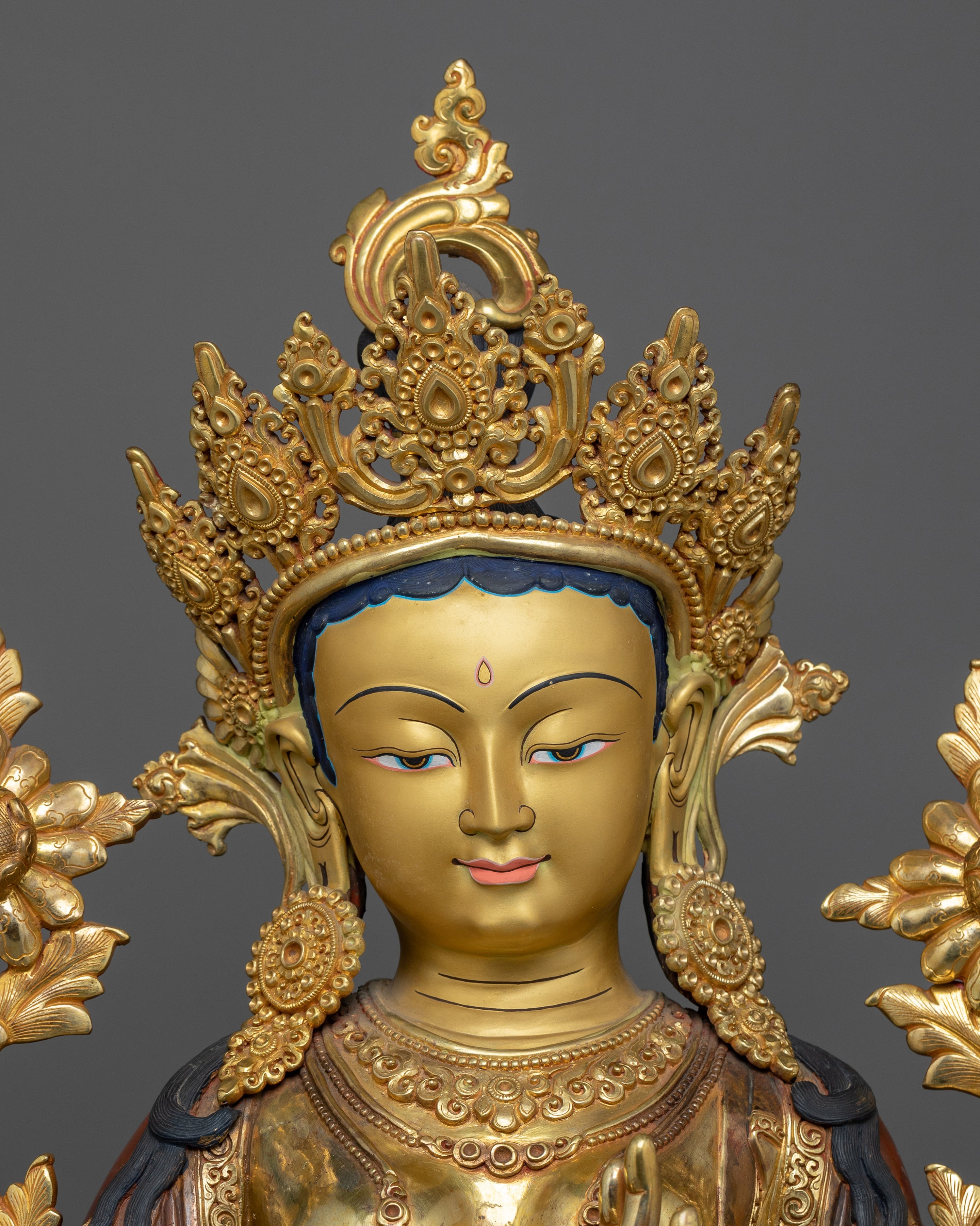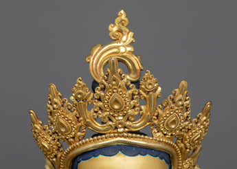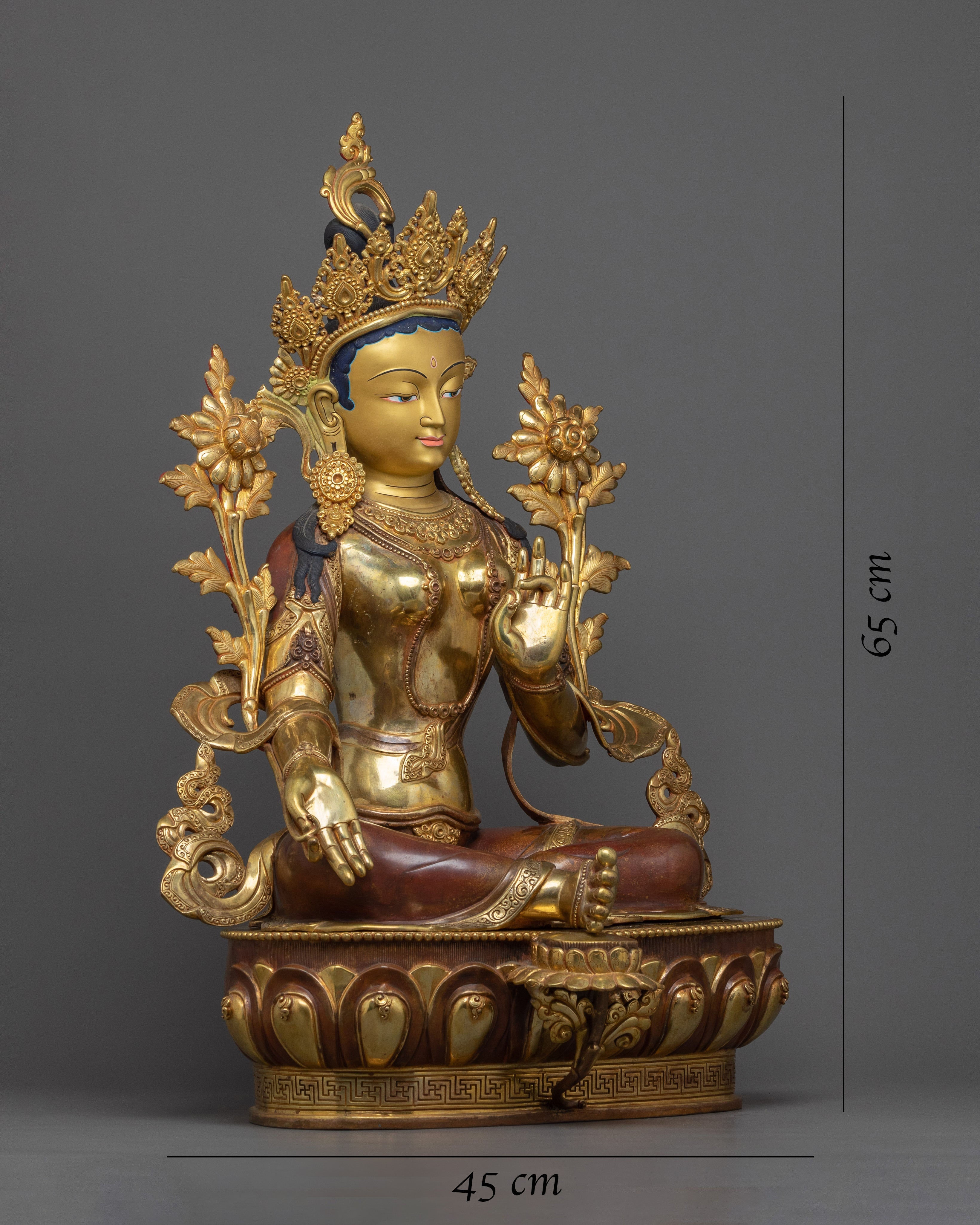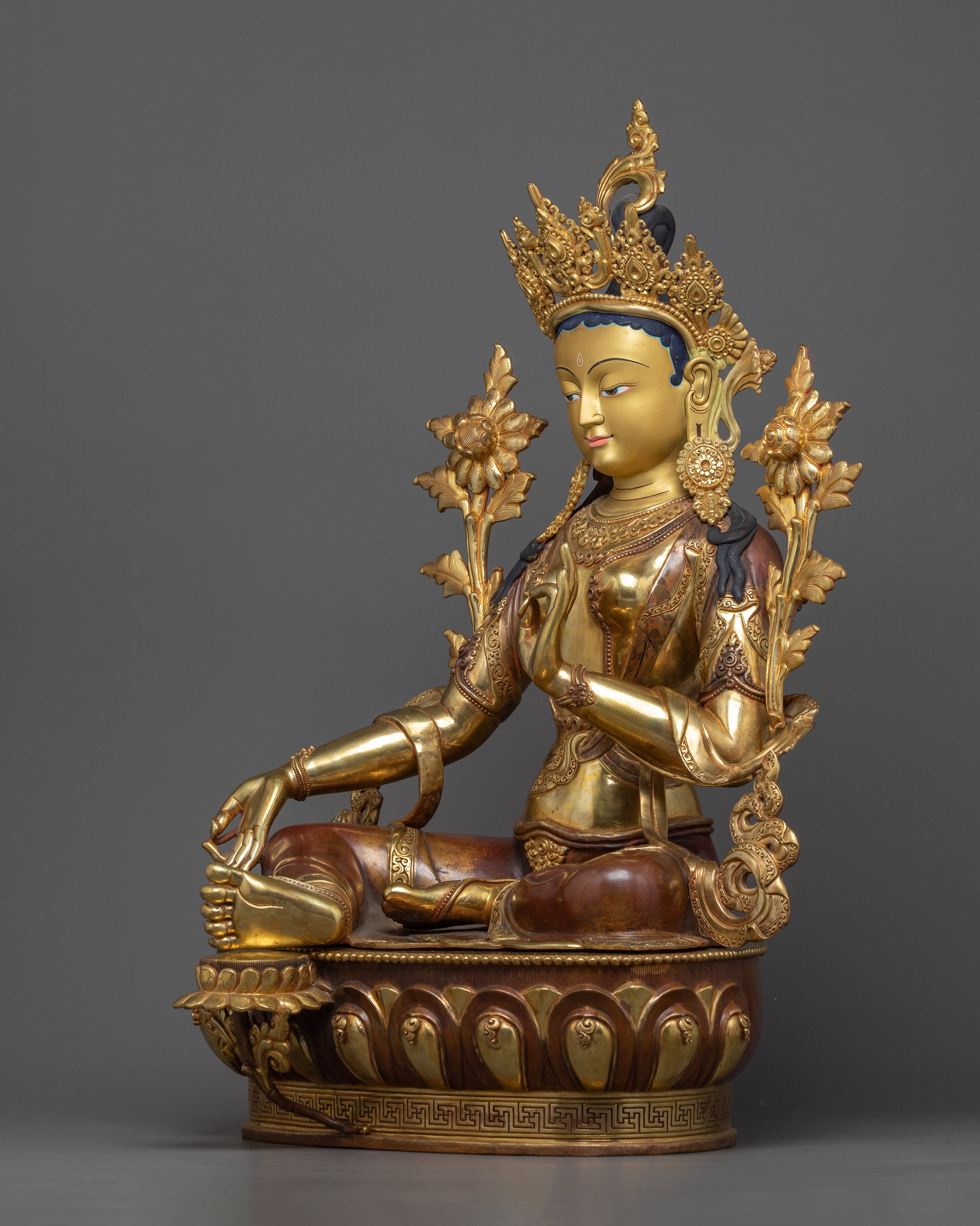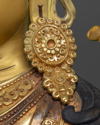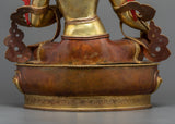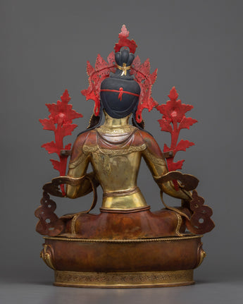 This statue is made of oxidized copper and has a rich, brown-like feel that is well contrasted by the sumptuous 24K gold gilding. Green Tara's delicate details, from her caring smile to her perfectly poised posture, are highlighted in the gold and acrylic paints. The scale and weight of this statue give it a powerful presence, making it suitable for a place of reverence in meditation areas or as an inspiring addition to your spiritual collection.