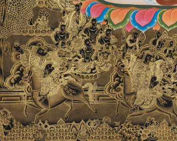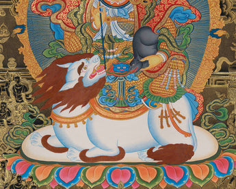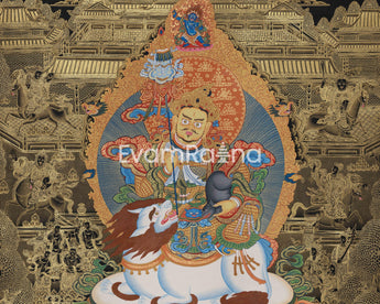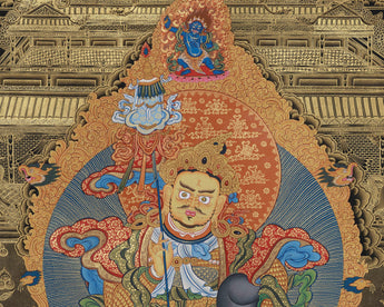 Radiating with authority and sacred splendor, the Guardian King Namtoshe thangka print is a high-quality giclée reproduction on cotton canvas, depicting the revered wealth guardian, Vaishravana, as a symbol of spiritual purity and royal power.