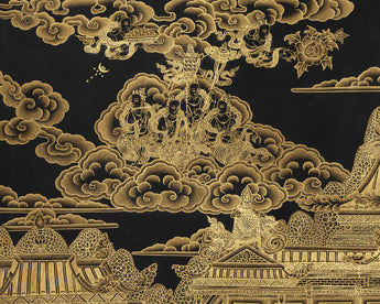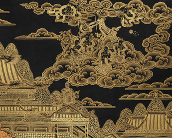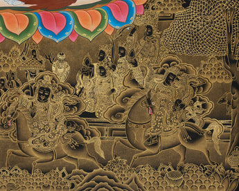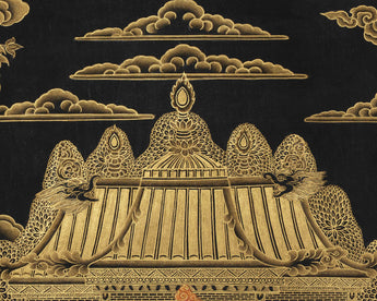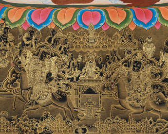 Set against a rich black background, the print glows with clarity and brilliance, allowing every figure and symbol to stand out with luminous depth. The giclée printing process preserves the textures and sharpness of the original painting, making the snow lion's fur, deity's armor, and palace details appear almost three-dimensional. The elegant play between shadow and light imbues the scene with a timeless, meditative quality. It is not only an exceptional visual statement but also a symbolic guide for invoking protection, stability, and abundance.