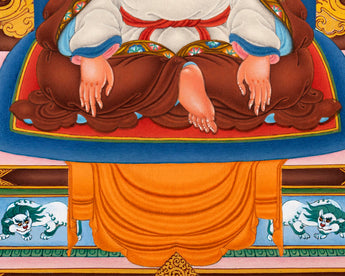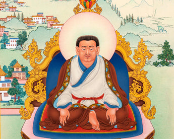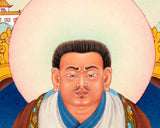 The Digital Print of The Translator Guru Marpa Lotsawa portrays him in seated crossed leg on an elegant throne. His hair is straight up, and his expression is calm and seated in a meditation posture. Heisknownas"MarpatheTranslator"due to his extensive translation work.