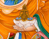 This is a wonderful thangka of Guru Rinpoche seated at the center and Mandarva and Yeshe Tsogyal at his side. Guru Rinpoche holds a vajra in his right hand and a bowl with a small vase in his left hand.