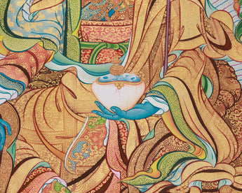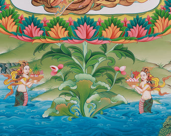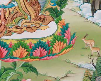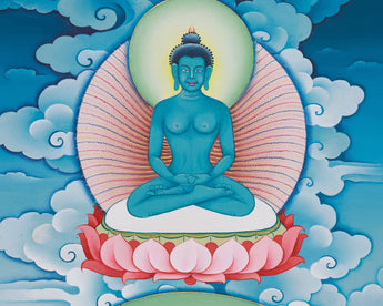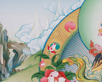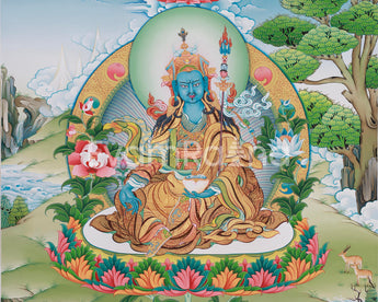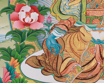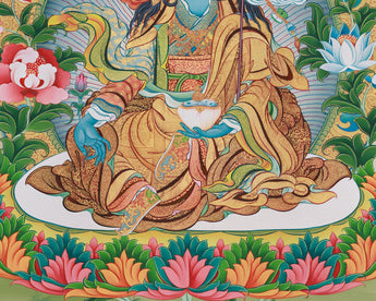 Introducing the Guru Urgen Menla, Medicine Buddha Form of Guru Rinpoche Thangka, a beautiful piece of spiritual art precisely created with Giclee printing on high-quality cotton canvas. This thangka depicts Guru Urgen Menla's calm presence, which embodies both Guru Rinpoche's wisdom and the Medicine Buddha's healing qualities. The brilliant colors and complex details are depicted with outstanding clarity, bringing viewers into a contemplative experience that awakens the senses and nourishes the spirit.