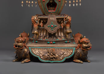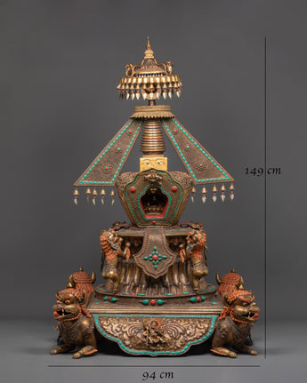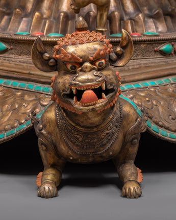 This Handcrafted Altar Shrine Stupa is a magnificent work of Tibetan Buddhist art, brimming with spiritual symbolism. The stupa, made of copper and gold plating, contains an exquisitely crafted Buddha statue in the center, surrounded by mythical creatures and other protective figures. Vajrapani, the defender of the Buddha's teachings, stands beneath the Buddha and wields the vajra (thunderbolt) to destroy ignorance and negative energy. Nearby, Garuda, a powerful mythical bird associated with both Hindu and Buddhist traditions, represents strength, freedom, and the elimination of obstacles. Standing 149cm tall and 94cm broad, this stupa is a towering focal point for any altar or shrine, instilling tranquility, protection, and spiritual energy.