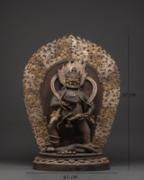 This magnificent Handcrafted Iron Black Dzambhala Statue, a representation of prosperity and spiritual strength in Tibetan Buddhism, will evoke abundance, power, and protection. This magnificent idol of a religious deity, which stands 57 cm tall and 42 cm wide and weighs 14.71 kg, is expertly fashioned from copper, iron, and brass. This statue is ideal for temples, wealth corners, and the shrines of serious practitioners due to the strong presence of Black Dzambhala, also known as the fierce manifestation of the wealth deity.