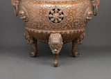The intricate two dragon-shaped handles indicate protection and power, symbolizing the strength and wisdom that are frequently called upon during ceremonial sacrifices. Intricate designs, such as the lotus patterns and the Dharma Wheel, represent the interconnectedness of all things and the progression of the spiritual path. Elevated on four detailed lion feet, this artwork not only depicts stability but also power, courage, and heavenly protection. Its commanding presence and religious significance elevate it beyond mere usefulness, making it a spiritual focal point.