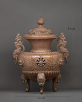 This Tibetan Sacred Ritual Incense Burner Set is a significant piece of spiritual craftsmanship designed for ceremonial use in temples, monasteries, and grand altar areas. This gigantic incense burner, which stands 82 cm tall and measures 62 cm in width, weighs 18.42 kg and is crafted from copper, featuring intricate, hand-etched designs. The design incorporates symbolic patterns, protective animal heads, and openwork details at the top, allowing smoke to rise and creating an immersive and spiritual environment during rituals.
